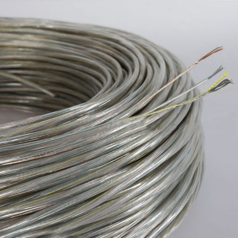 Câble électrique transparent à trois conducteurs en 0,3mm² avec une isolation PTFE interne et PVC pour la gaine extérieur pour un diamètre total de 2.7mm.