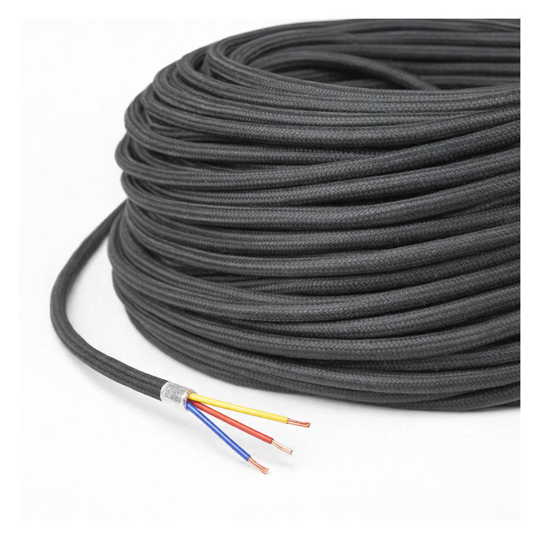 Câble textile rond couleur noir spécial interrupteur tactile Amélia – 3 conducteurs phase et neutre plus câble pour info tactile.