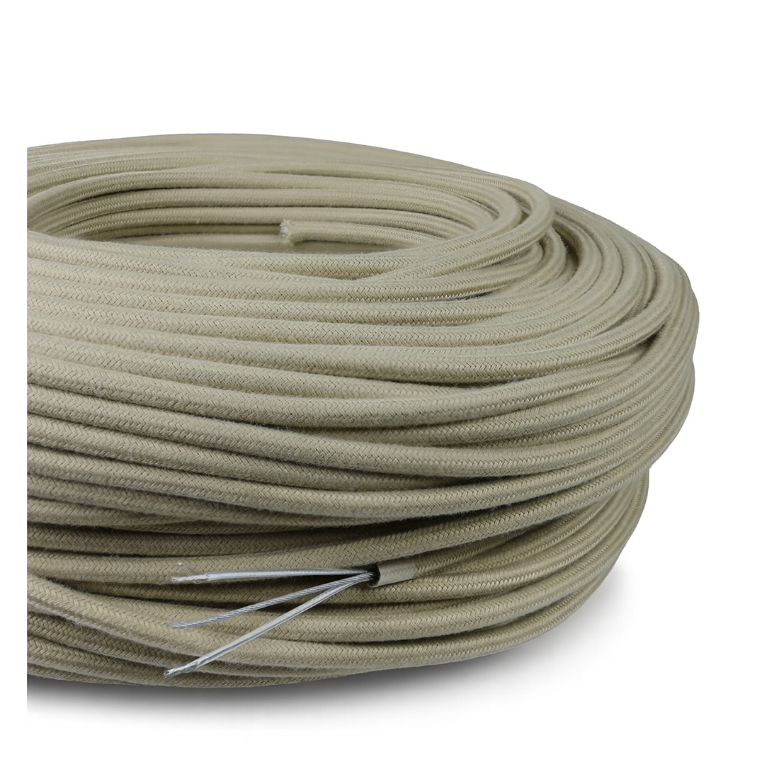 Copper-coloured round braided fabric cable with two 0.75 mm² conductors and 1.2 mm diameter stainless steel suspension cable with PTFE sheath on the electrical and PVC conductors.