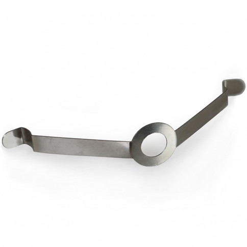 Un ressort de fixation en acier inoxydable à lame perçage central pour tube M10, avec griffe de maintien d’un globe en verre, d'une vasque ou autres accessoires pour luminaires - longueur 98mm.