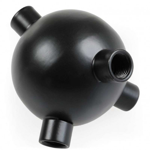 Boule en acier noir à quadruple sorties M10, un taraudage pendulaire et trois autres disposés à 120° orientée vers le bas.