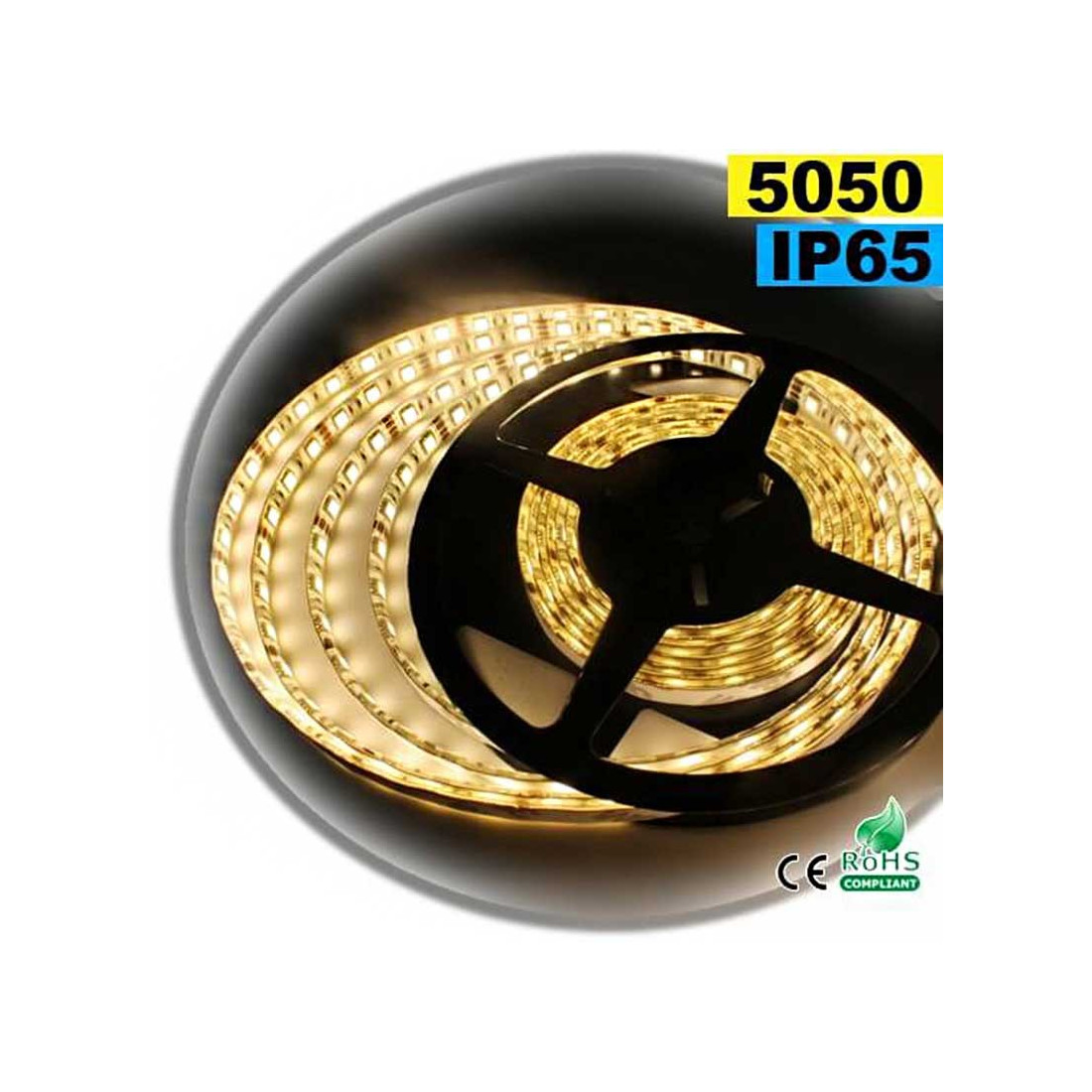 Strip LED flexible autocollant de 30 mètres équipé de 60 LED par mètre type SMD 5050, couleur d'éclairage blanc chaud.