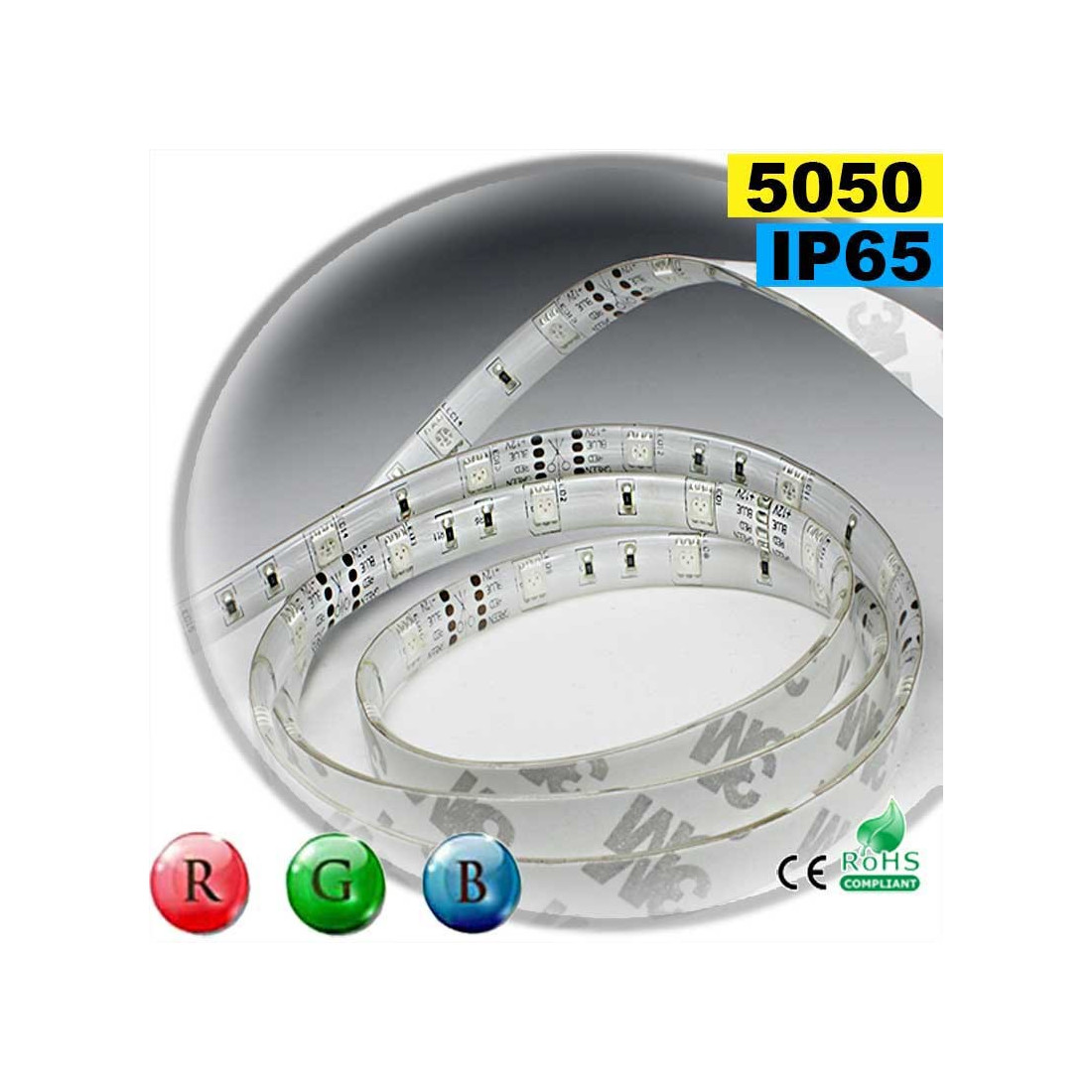 Strip LED flexible autocollant de 5 mètres équipé de 30 LED par mètre type SMD 5050, en RGB.