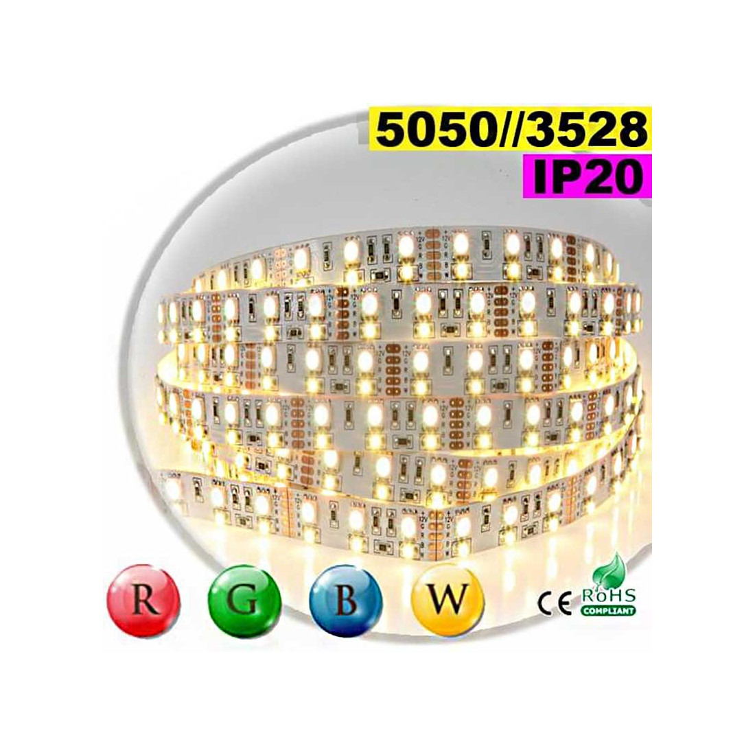 Strip LED en 24 volts DC d'une largeur de 15mm, un double assemblage de LED RGB 5050 pour une ambiance lumineuse multicolore et d'autres LED en format 3528 pour l'éclairage traditionnelle blanc chaud.